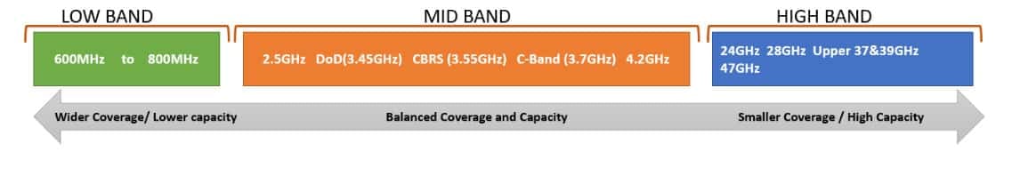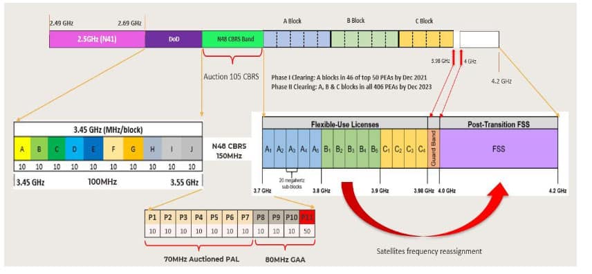 FCC defines Mid-band 5G spectrum ranges from 2.4 GHz to 4.2 GHz between low and high frequency bands, and has segments for 2.5 GHz (N41), 3.45 GHz (DoD), 3.55 GHz (CBRS N78) and 3.7 – 4.2 GHz (C-Band N48).