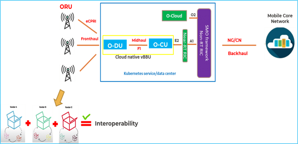 Building upon the concept of vRAN (virtualized RAN), O-RAN or ORAN (Open Radio Access Network) takes it a step further by focusing on standardization and openness and aims to open the cellular network infrastructure by promoting open interfaces, flexibility and interoperability between different equipment vendors. The traditional RAN and vRAN architecture are characterized by proprietary and integrated solutions from a single vendor, ORAN breaks down these proprietary barriers and creates an open and more collaborative ecosystem.